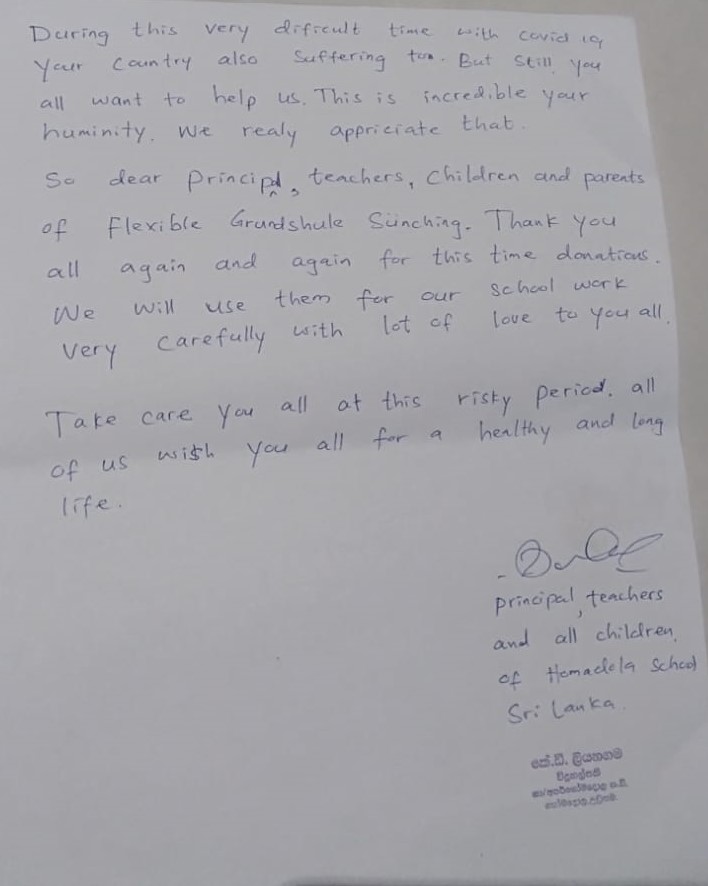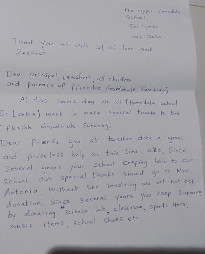 Obwohl coronabedingt im Frühjahr/Sommer 2020 leider kein Spendenlauf möglich war, spendeten einige Lehrer und Eltern Geld für unsere Patenschule. Dieser Brief erreichte Frau Brandl vor Kurzem: